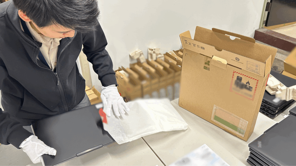 キッティングセンターに運ばれてきたPCたちは、まず一台ずつ開梱されます。